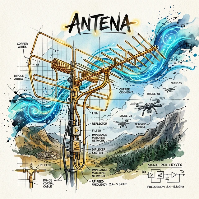 - 2.4 GHz (Control y Wi-Fi): Una banda saturada donde la eficiencia de la antena es clave para no perder el enlace (failsafe).