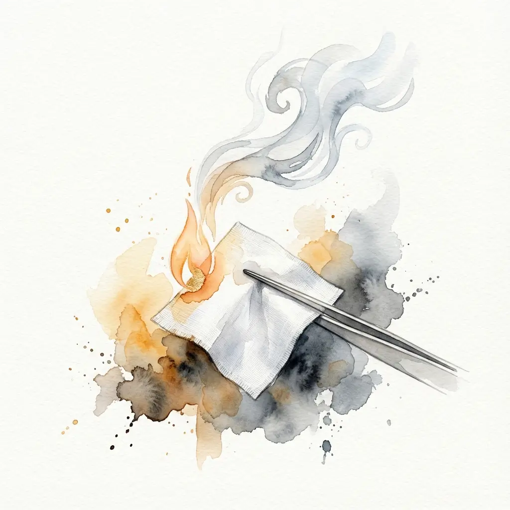 Ventilación crítica: Las fibras sintéticas liberan gases tóxicos al arder. Nunca realices esta prueba en espacios cerrados.Extinción inmediata: Ten siempre un recipiente con agua al lado. Algunas fibras sintéticas pueden fundirse y adherirse a la piel.